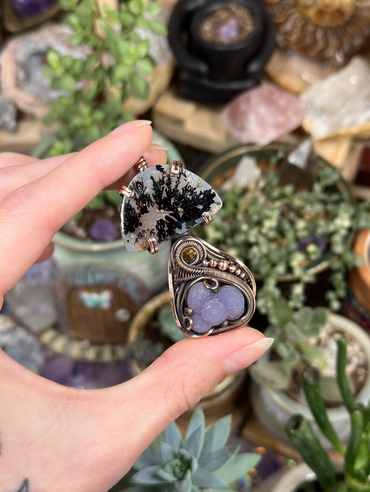 Dendritic Agate, Grape Agate, and Citrine mushroom amulet wrapped in oxidized copper wire