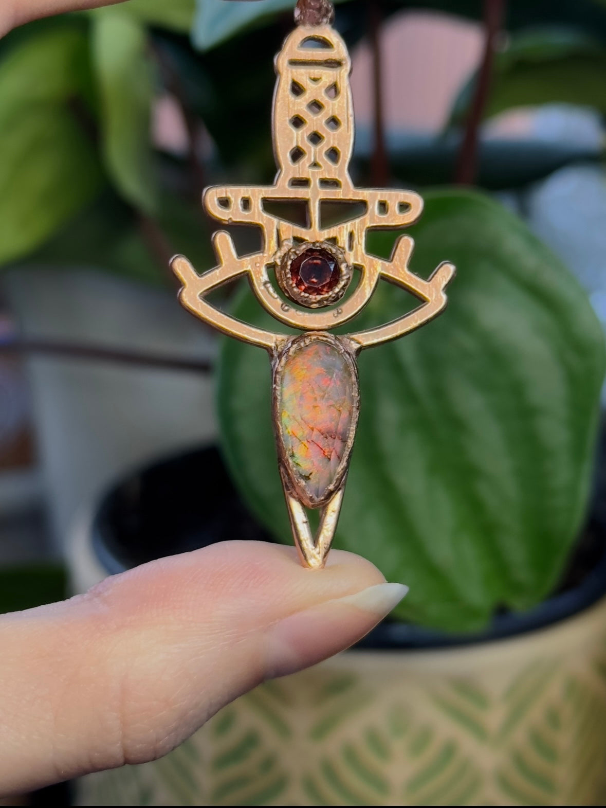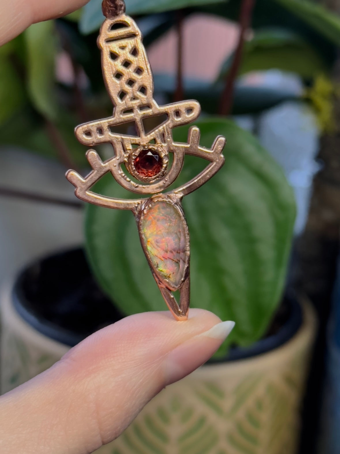 Garnet and Sterling Opal copper electroformed eye dagger pendant